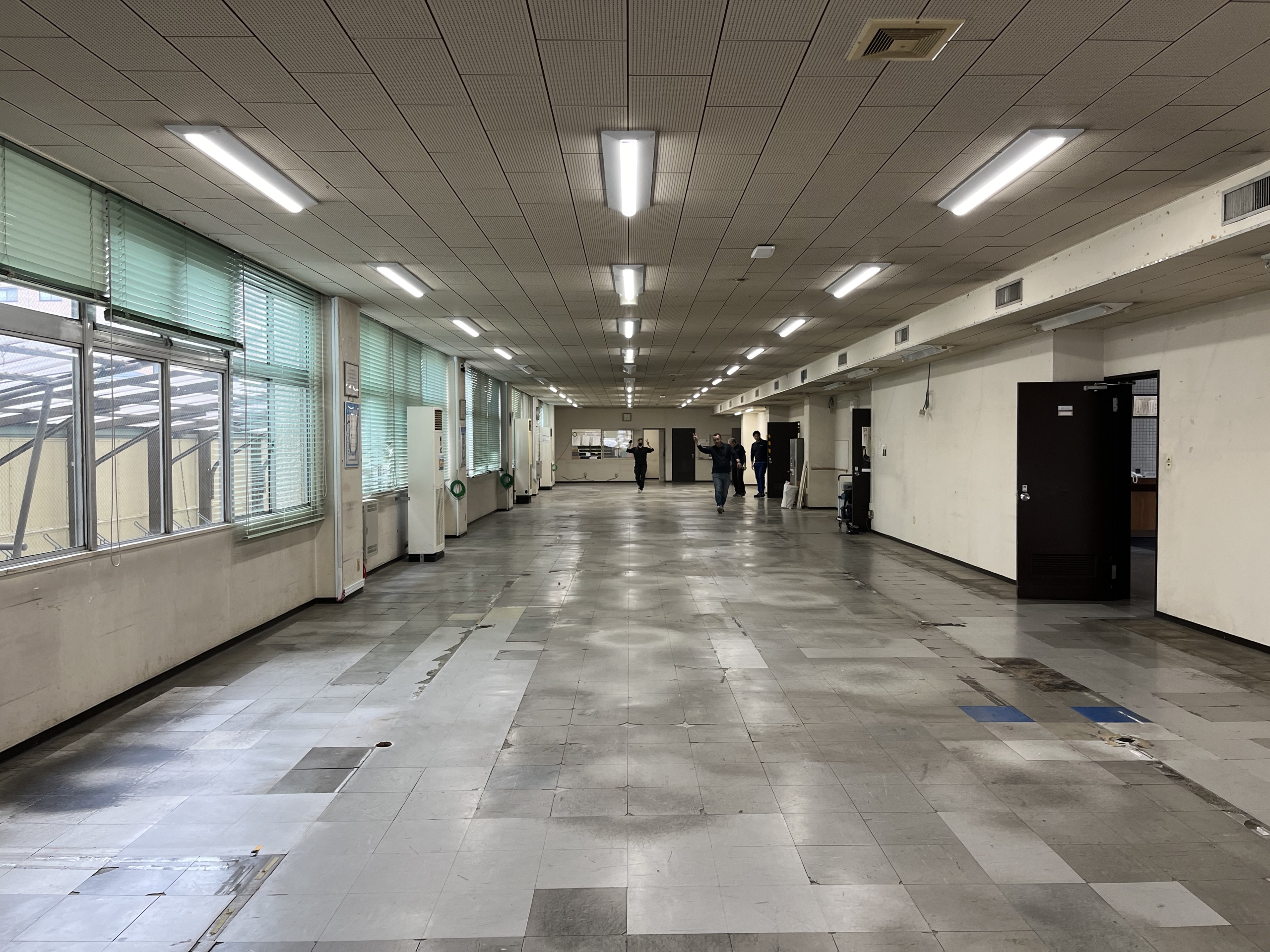 写真は、家具や配線を撤去した状態→タイルカーペット敷設工事中→完成となります。