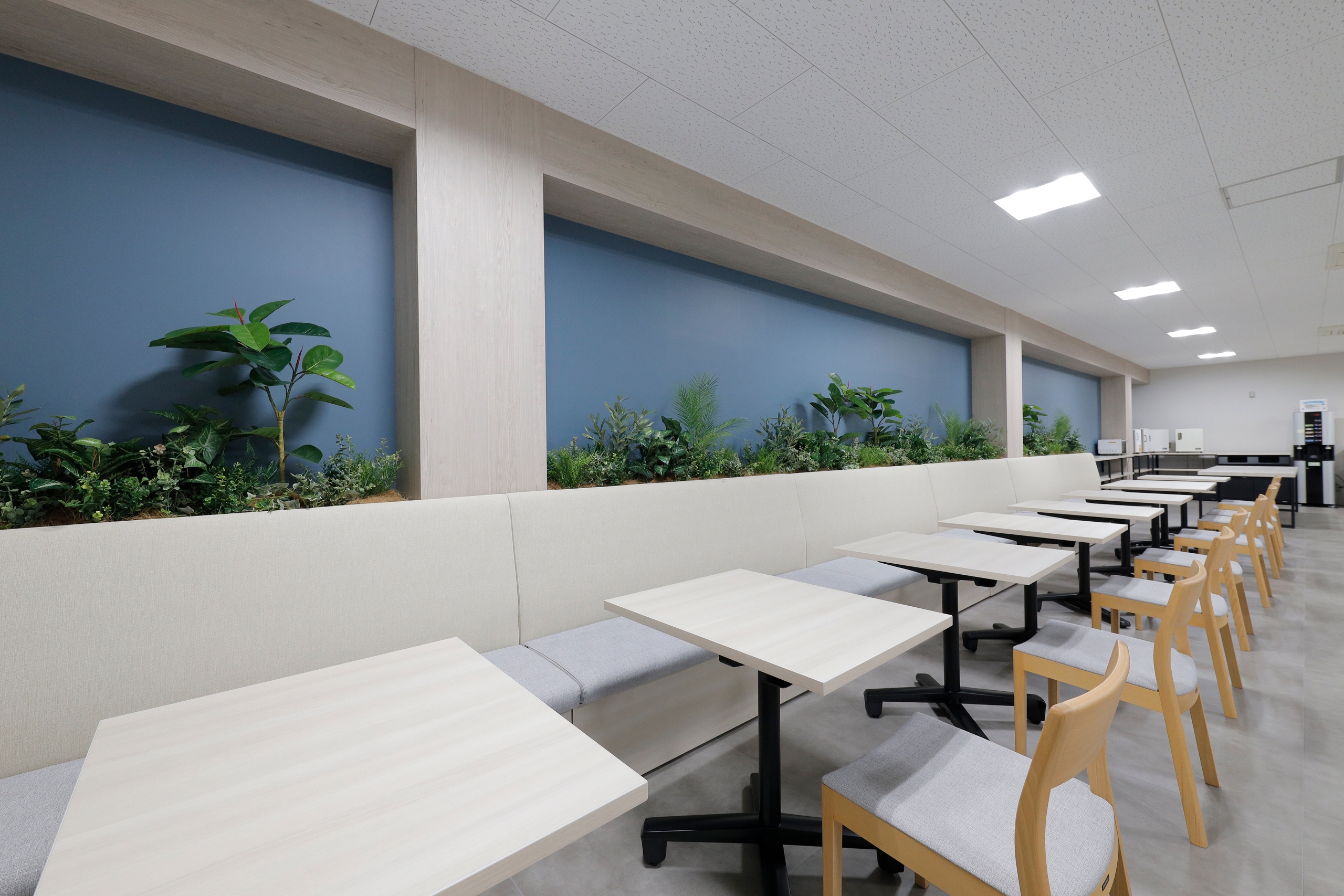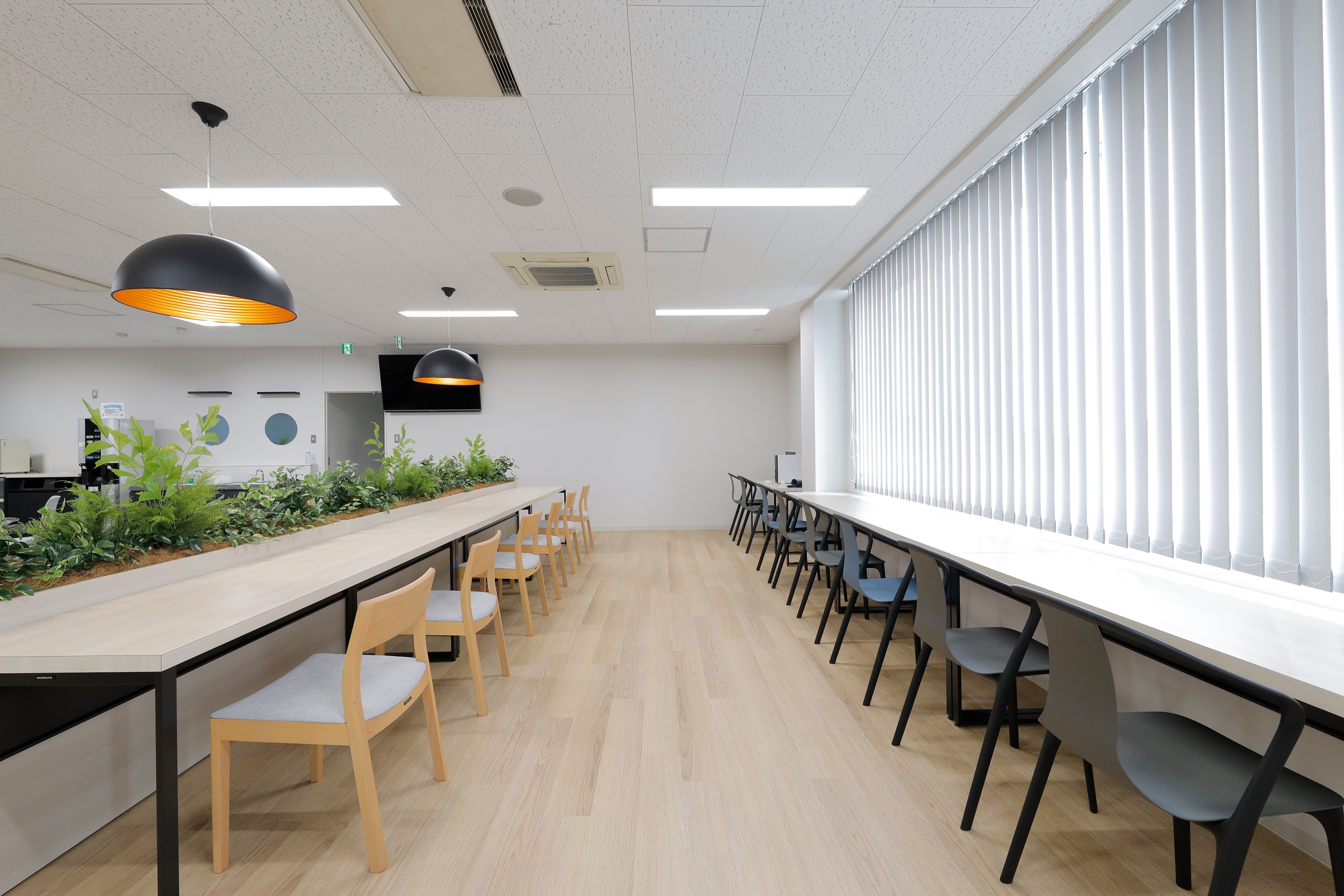 お客様からはリニューアルのイメージとして、「インテリアテイストが非常に良い」と感じられたモデルオフィスの写真を共有いただきました。このイメージをデザインコンセプトの柱とし、食事をする場所だけではないカフェテリアのような雰囲気の食堂の実現を目指しました。特に、窓際のカウンター席や明るい床材を採用したエリアなどは社員が食事や休憩をしながら外の景色を眺め、心地よくリラックスできる環境となっています。