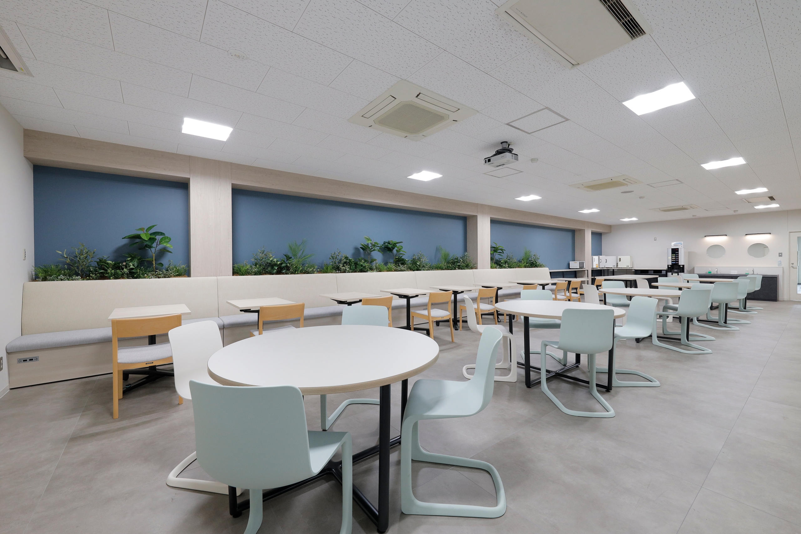 食堂の一角にプロジェクターとスクリーンを設置し、多目的な利用を可能にしました。これにより、単なるリラックスの場としてだけでなく、部署やチームでの情報共有の場としても機能します。会議室のような閉鎖感や堅苦しさがないため、オープンな雰囲気でのミーティングや社内イベントなどで活用されています。