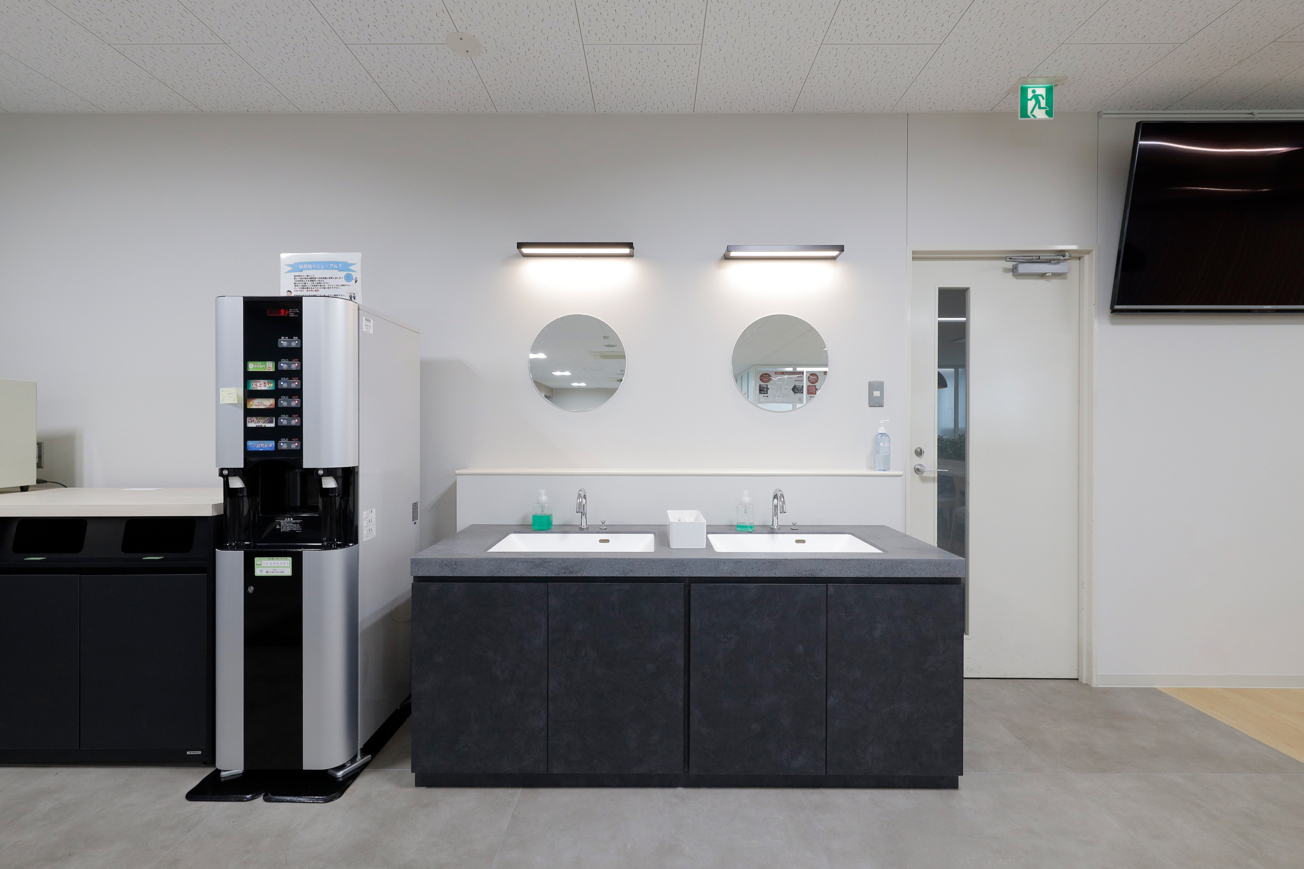 現場作業から戻られた社員が使用する手洗いスペースは、細部まで品質を追求し、デザインに強いこだわりを持って設計されたエリアです。社員の利用シーンを考慮し、機能性だけでなく、デザイン性の高さを両立させることに注力しました。壁面のモニターでは、工場での現場の状況や生産状況が映し出され、情報共有に利用されています。