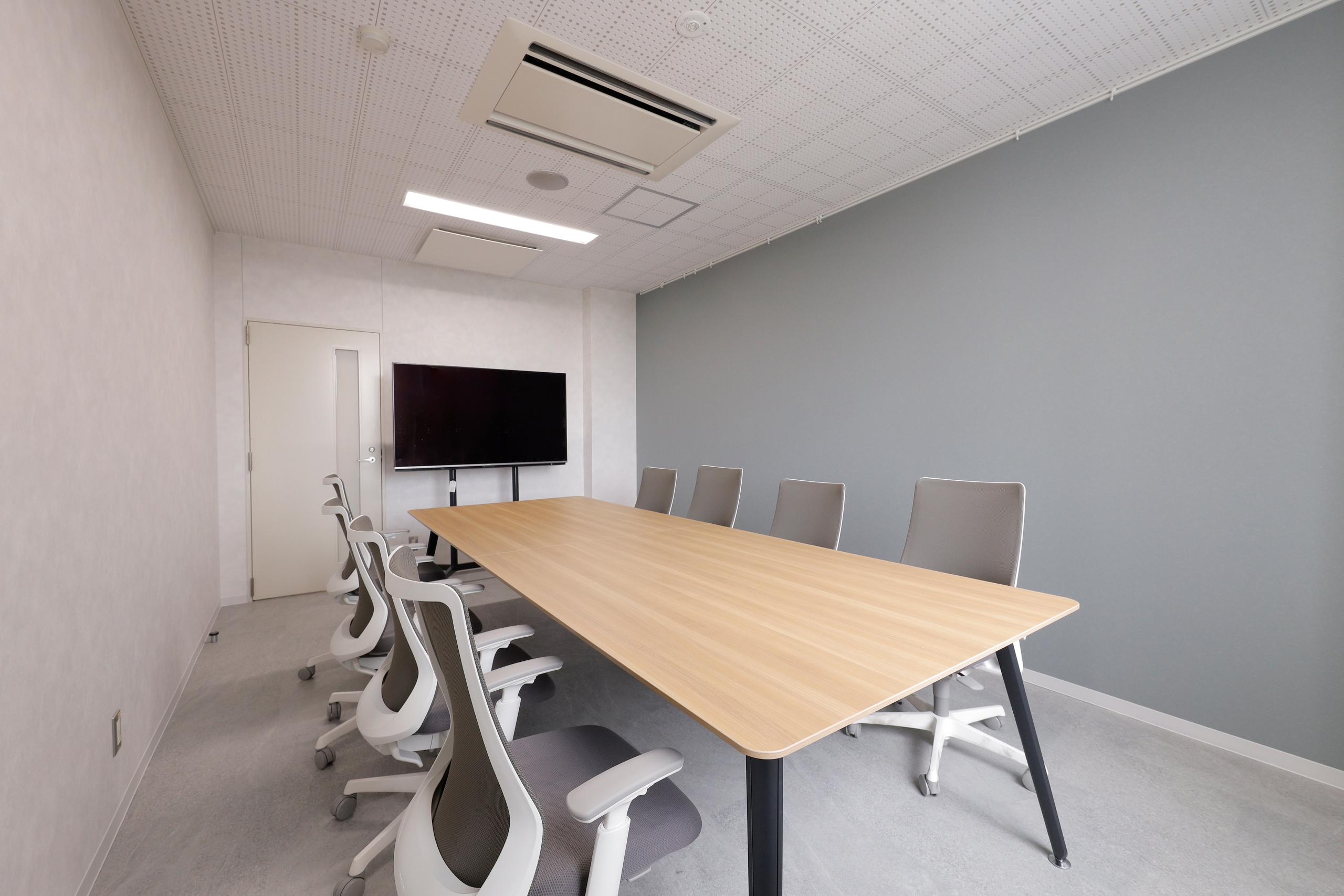 会議室のリニューアルでは、特に来客時の使い勝手向上と社内ミーティングの効率化を目的としています。情報共有のスピードとミーティングの質を高めるため、以前は一部屋にしか設置されていなかったモニターを増設し、大型モニターとスクリーンをそれぞれ設置するなど、IT環境の整備を徹底しました。